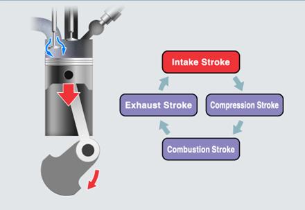 katup hisap membuka. Langkah ke bawah piston hanya menghisap udara ke dalam